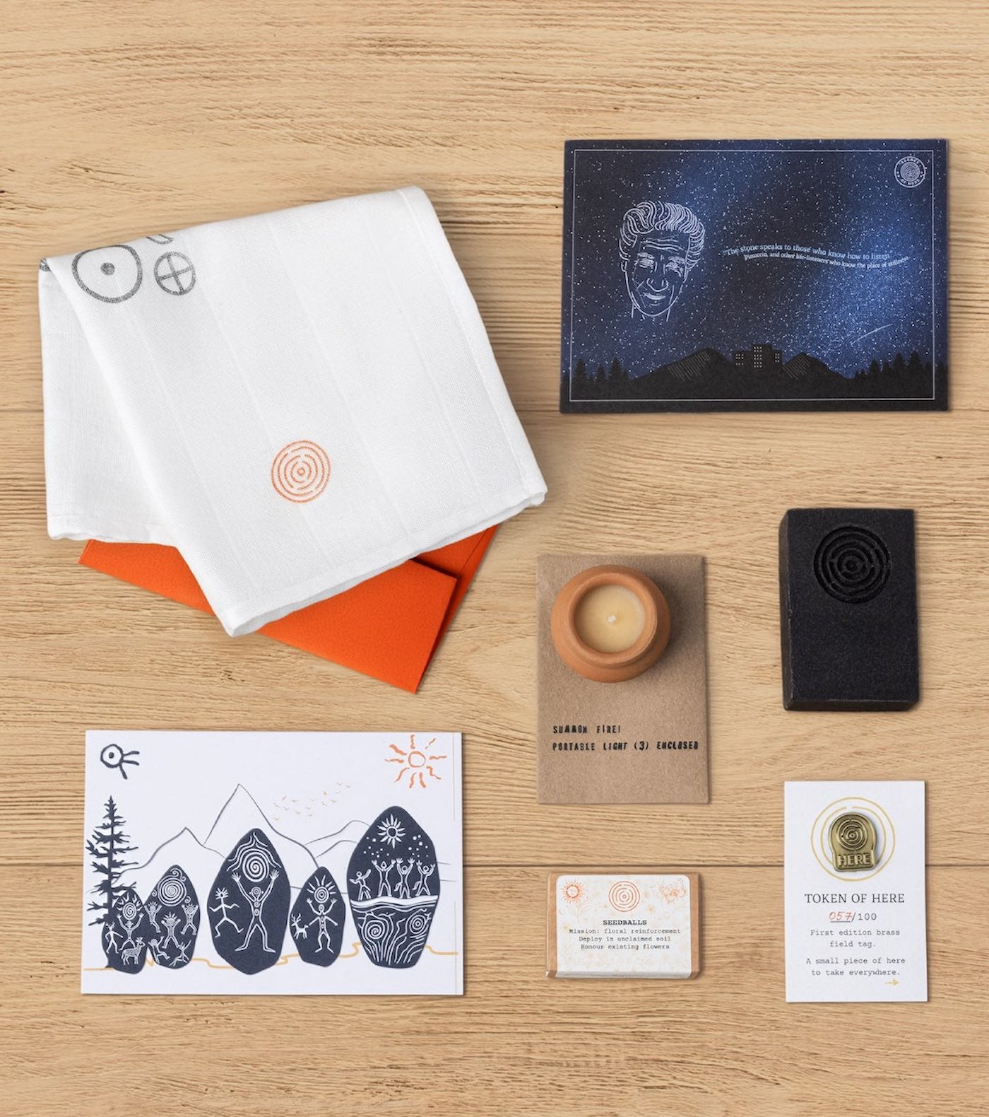 A numbered brass token, wildflower seedballs, and a muslin wrap stamped with our glyphs. Each chosen for its best qualities.